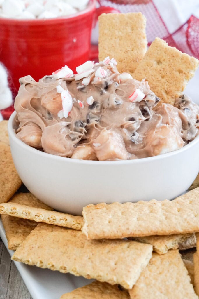 - Garnish. Transfer the dip to a serving bowl and then top with your favorite hot chocolate garnishes. I like mini marshmallows, chocolate chips, and crushed peppermint candy. But you can go crazy!