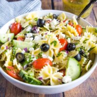 I am a huge fan of Greek flavors, they just blend so well together. This Greek Salad that is very similar to this without the pasta is a staple in the summer with fresh veggies available.