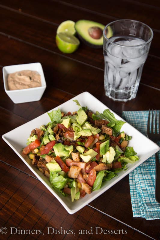 This Mexican chopped salad is great because you top with whatever your favorite taco toppings are and the dressing is creamy, smoky, a little spicy, and is perfect with it.