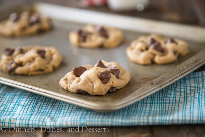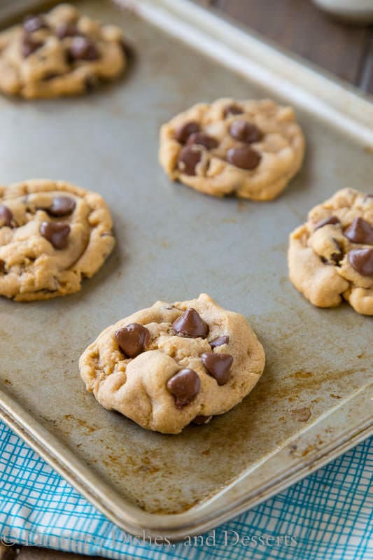 Well, these peanut butter chocolate chip cookies just might be the thickest and softest cookies I have ever tried! They are so decadent and delicious! These aren’t your average peanut butter cookies that just have chocolate chips in them. They are more like a chocolate chip cookie that has peanut butter in it.