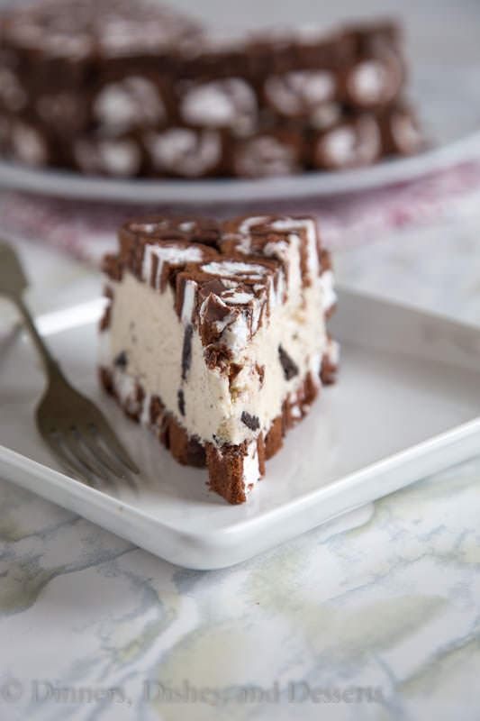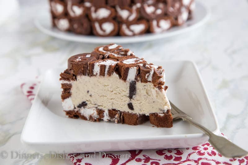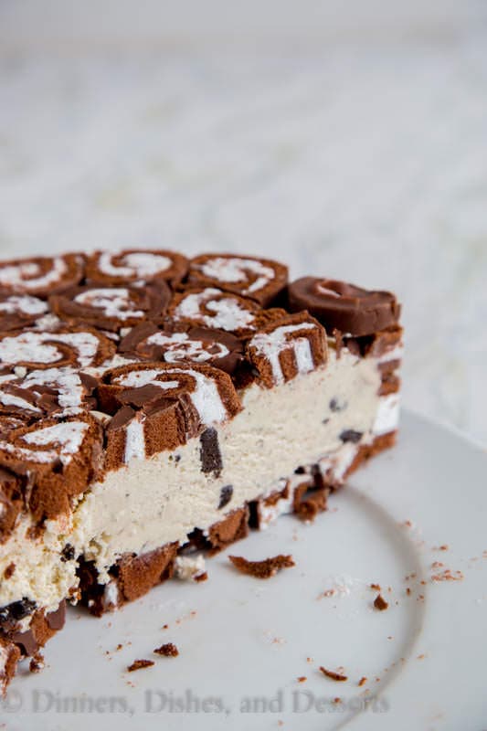 This cake can be a little messy to assemble. I like to use a serrated knife to cut the swiss cake rolls. You still get bits of chocolate all over the cutting board, but just add those to the layer of your ice cream cake.