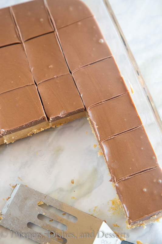 - Place chocolate chips and peanut butter into a bowl. Microwave for 1 minute. Stir until melted and smooth. Pour over peanut butter layer. Chill for 2 hours, until firm.