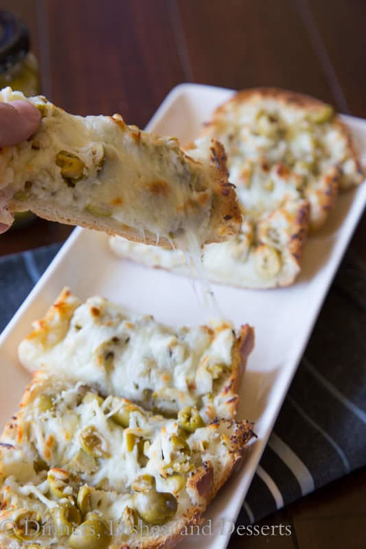 Garlic Olive Cheese Bread – take you garlic bread and turn it up a notch! Top it with green olives and lots of cheese for so much delicious flavor
