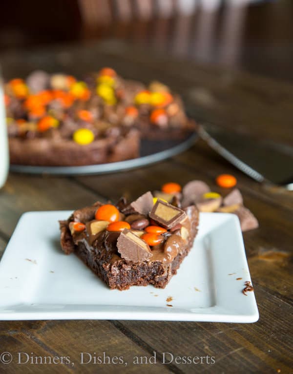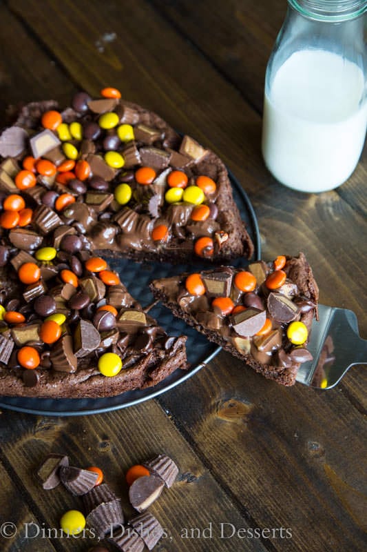 - (Optional) Reese’s Pieces or M&M’s – I like to top my Brownie Pizza with these kinds of candy to add color and interest to the final display.