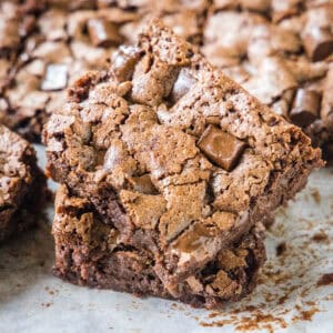 These chocolate chunk brownies are fudgy, rich, chocolate-y and so good. You will notice the ingredients are just a little different than other classic Homemade Brownies, which is what makes them special.