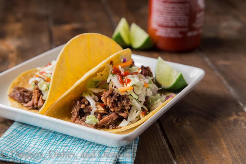 Slow Cooker Korean Beef Tacos – Let your crock pot do the work and get perfectly tender, sweet and spicy beef that is perfect piled on a tortilla topped with a little Korean coleslaw.