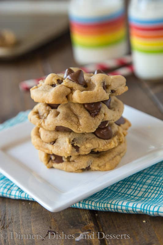 Well, these peanut butter chocolate chip cookies just might be the thickest and softest cookies I have ever tried! They are so decadent and delicious! These aren’t your average peanut butter cookies that just have chocolate chips in them. They are more like a chocolate chip cookie that has peanut butter in it.