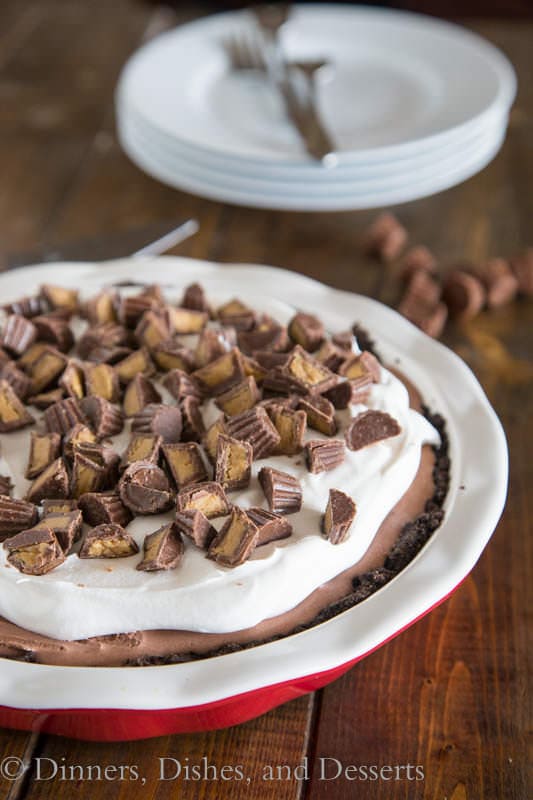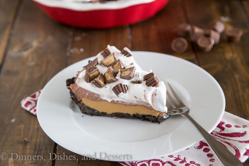 No bake peanut butter pie is super creamy and delicious. An Oreo pie crust with a layer of thick peanut butter, creamy chocolate mousse, and then whipped cream! Doesn’t get much better than that. If you like chocolate and peanut butter, you are going to love this!