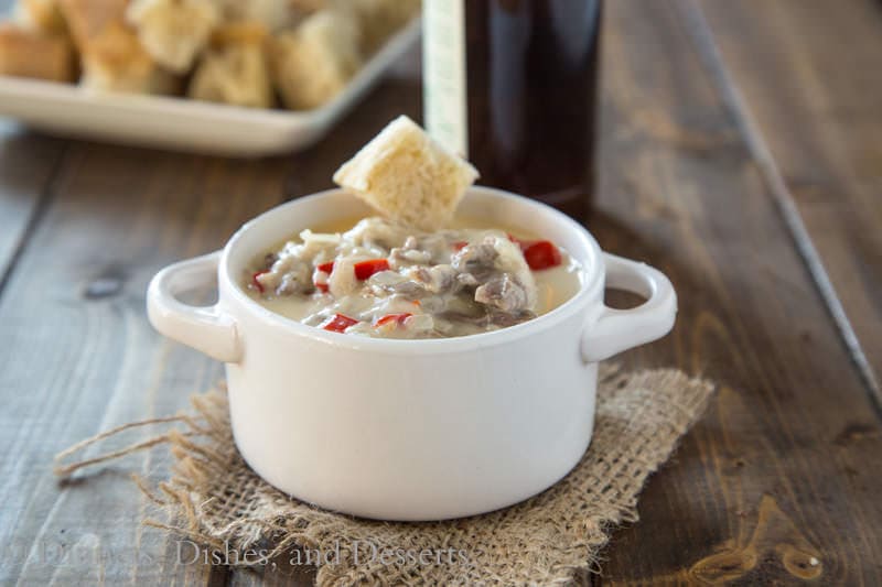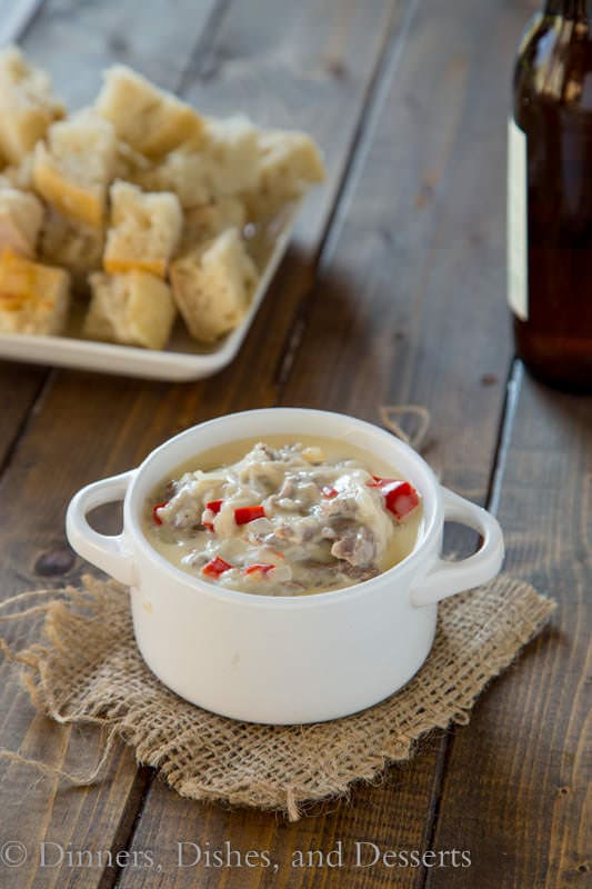 Transfer the finished dip to a small slow cooker on the warm setting, stirring occasionally to keep it smooth and melty. If you have leftovers you can cover and place in the fridge for 3-4 days. To reheat you can use a saucepan on the stovetop, a crockpot, the oven or the microwave. You can add a little milk if necessary to loosen it up.