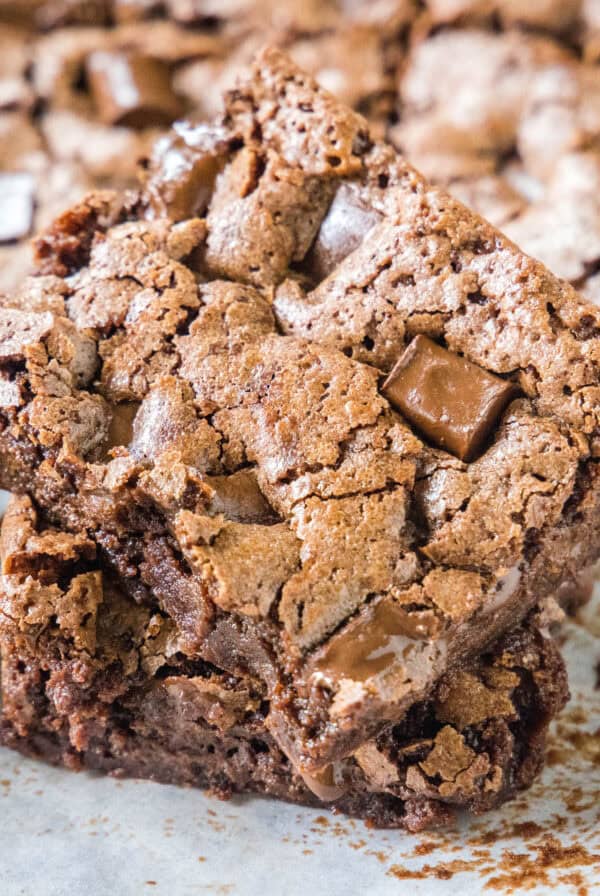 These chocolate mousse brownies are best stored in the fridge. You don’t want the mousse to melt and no be safe to eat. I do like to let the brownies sit out for about 20 minutes before we eat them though. Just so the brownie can get closer to room temperature and you can really taste the chocolate.