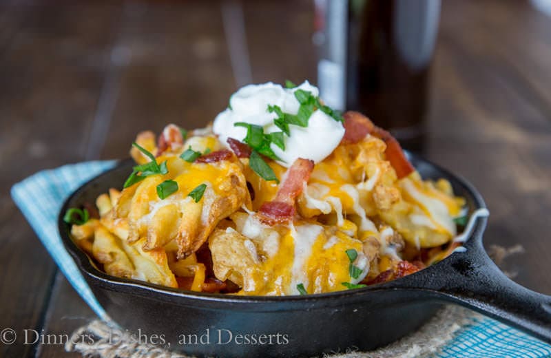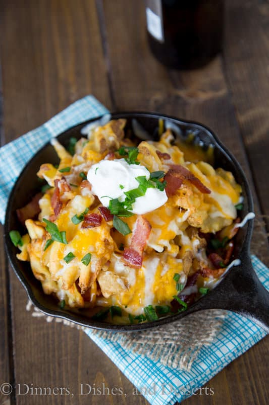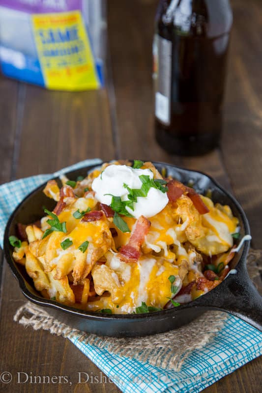 Crispy waffle fries topped with cheese and bacon and then garnished with sour cream and green onions. Pretty darn simple, but oh so comforting and good.